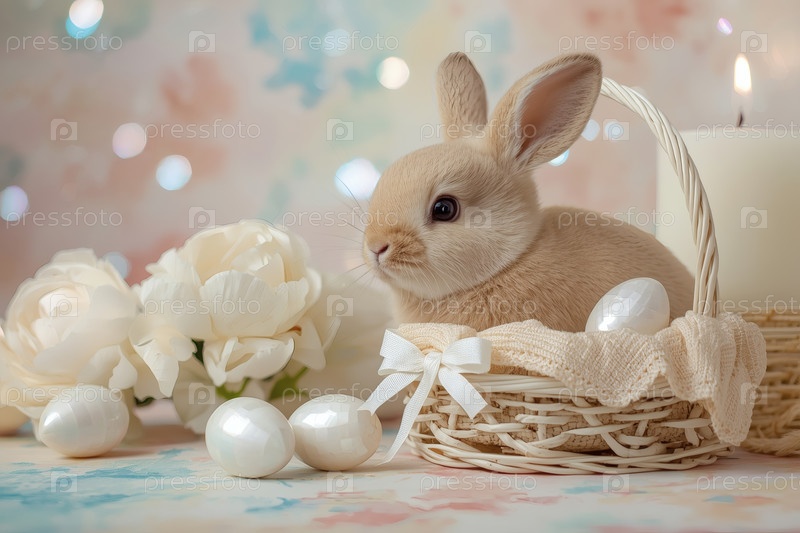 Концепция счастливых пасхальных праздников: нежные жемчужинные яйца в корзине, кролик и деликатные цветы на пастельном фоне