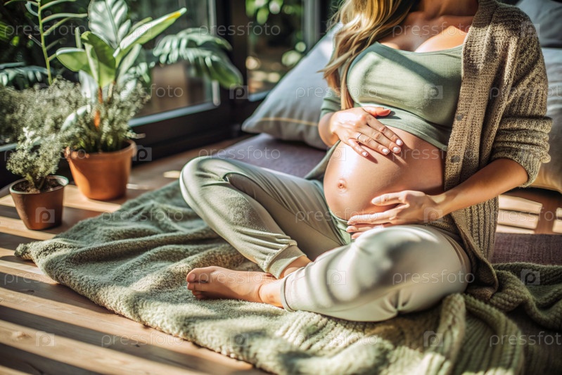 Молодая беременная женщина держит свой живот на фоне интерьера дома. Близко. Женщина готовится стать матерью. Беременность и роды