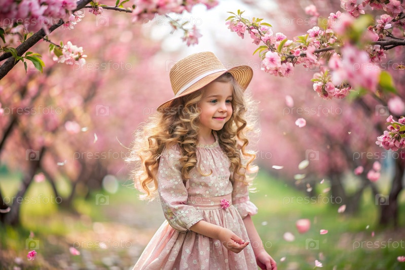 Портрет красивой маленькой кудрявой 4-летней девочки в соломенной шляпе и платье в цветущем розовом саду яблок. Детство. Ребенок позирует и смотрит на камеру