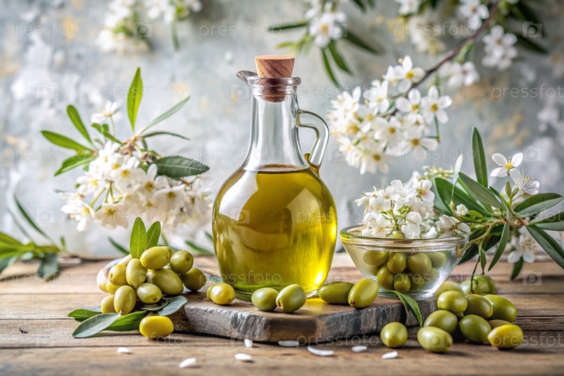 Оливковое масло в красивой бутылке со свежими маслинами и цветущими оливковыми ветвями на светлом фоне