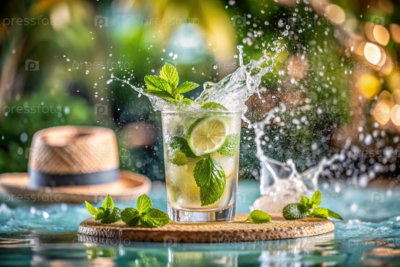Коктейль алкоголя сочные фрукты с кубиками льда и нарезами лимона, лайма и мяты