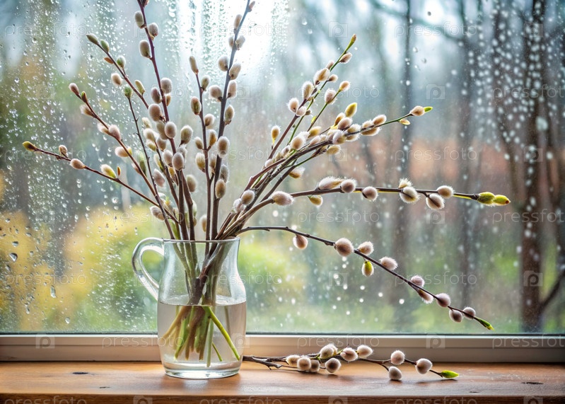 Большой план букета ивы в стеклянной вазе на фоне старого белого окна с капельками дождя на стекле