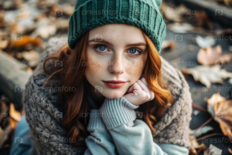 Осенний портрет. Близкий план молодой рыжеволосой женщины с выразительными зелеными глазами в вязанной шляпе и свитере