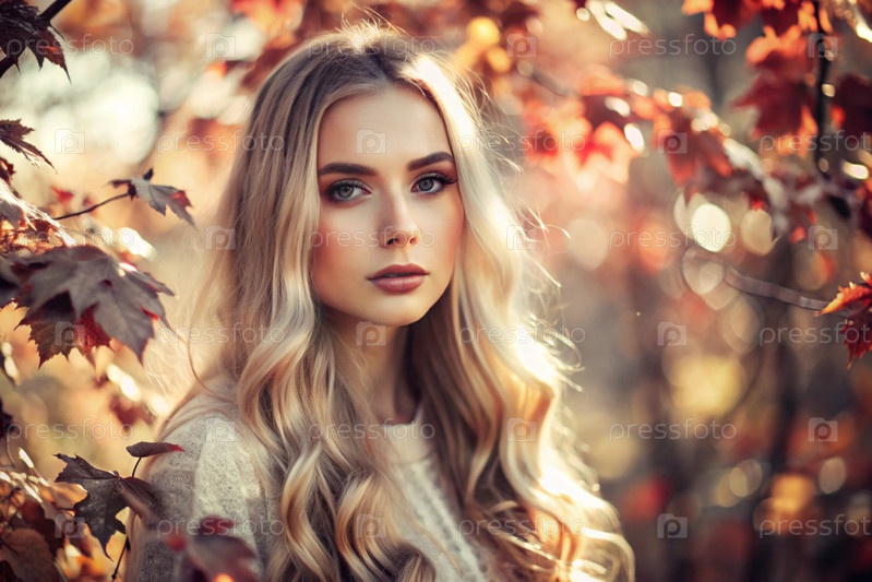 Осенний портрет. Близкий план молодой блондинки с выразительными глазами в вязанном свитере. Красивая девушка в осенних листьях