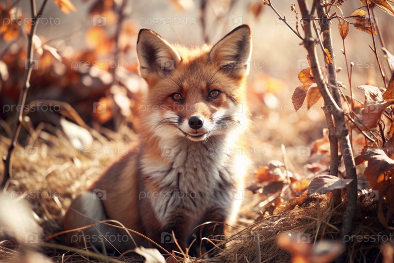 Красная лиса, сидящая среди осеннего листвы.Охота на животных