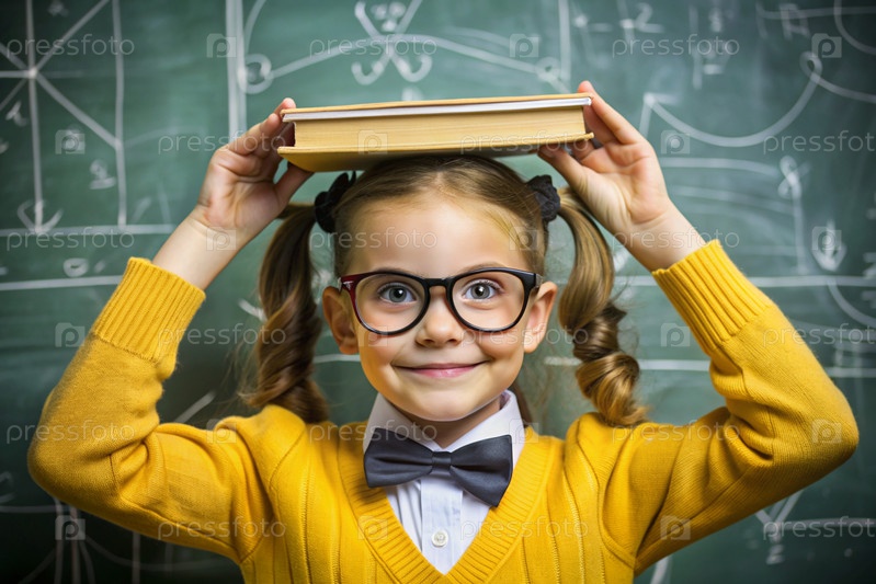 Красивая девушка с очками и книгами на голове. Ребенок впервые идет в школу. Ребёнок в классе со доской на заднем плане. Возвращение к школе