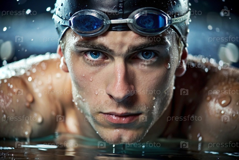 Спортивное плавание. Мужчины-плаватели. Спортсмен с очками в бассейне во время соревнований на близком расстоянии. Человек смотрит на камеру