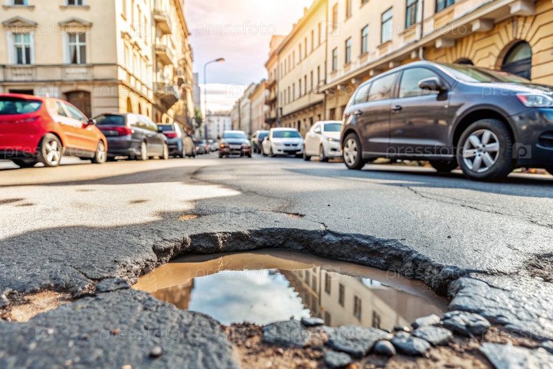 Ужасное состояние дорог. дыра в асфальте на городской улице. ремонт дороги. городская улица плохого качества