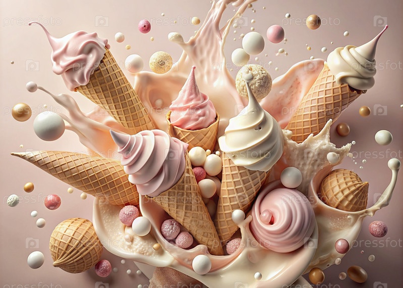 Абстрактная композиция с таяющим мороженым. Плески и брызги мороженого. натюрморт, изображающий перевернутый конус мороженого на светло-розовом фоне