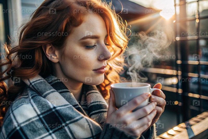 Красивая рыжеволосая женщина, завернутая в клетку с кружкой горячего кофе на красивом террасе под лучами заходящего солнца