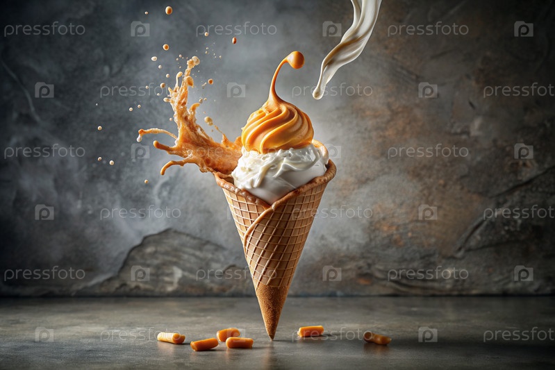 сладкий десерт. мороженое с ароматизированным карамелем. белое ванильное мороженое на фоне серых тонов. карамэль, капающий в мороженом