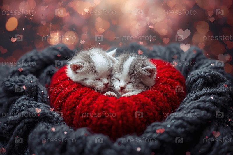 Концепция Дня святого Валентина. красное вязаное сердце и два серых котенка. открытка с котятами на вязанном одеяле