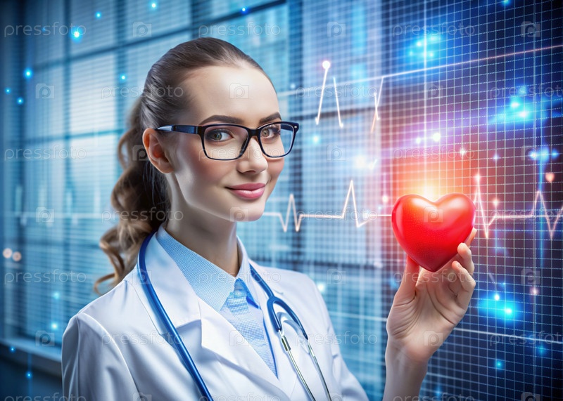 Медициной молодой красивой девушки является кардиолог с очками в кабинете со стетоскопом.Красные цифровые коды в виде частоты сердечных сокращений на виртуальном экране.Цифровые технологии будущего