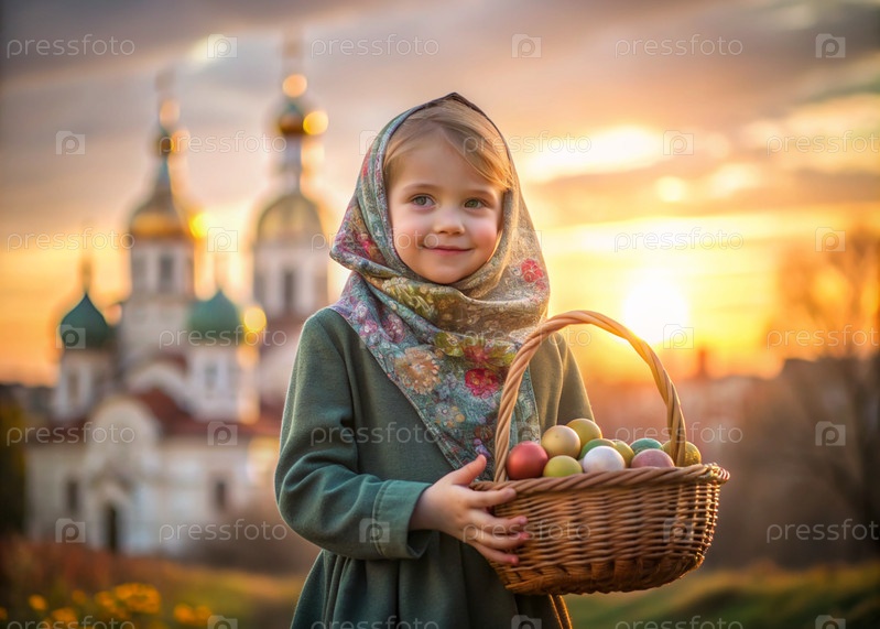 Счастливая Пасха. Христианство. Портрет трехлетней девочки в русском народном шале с плетеновой корзиной с пасхальными яйцами в руках на фоне православного храма