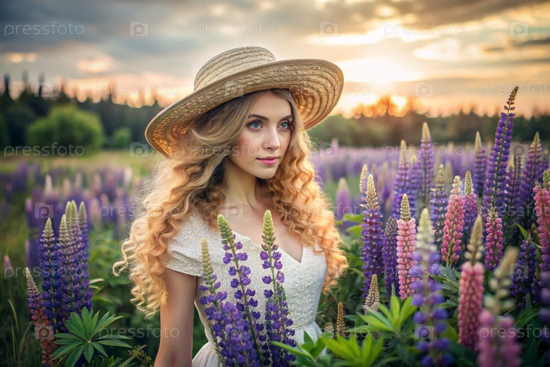 Портрет красивой кудрявой девушки в соломенной шляпе на цветущем поле люпинов.Девушка позирует и смотрит в камеру