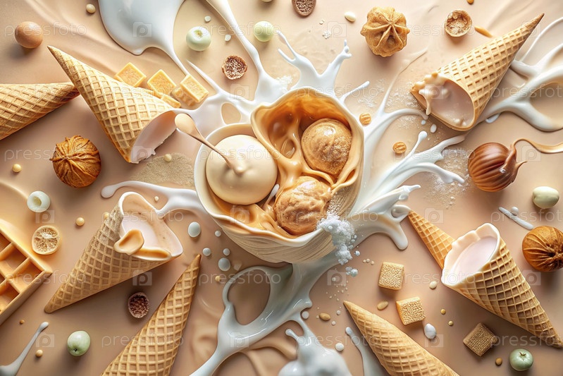 Абстрактная композиция с таяющим мороженым. Плески и брызги мороженого. натюрморт с перевернутым конусом мороженого на бежевом фоне
