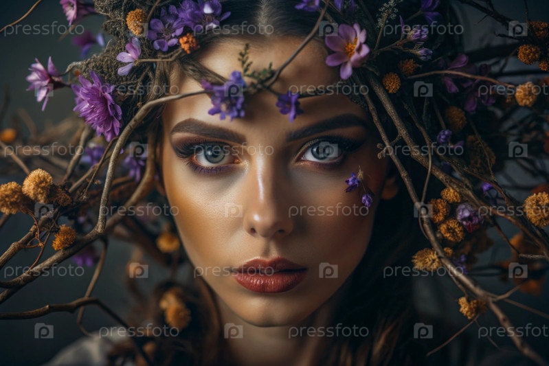 Творческий баннер для салона красоты. Профессиональный гримёр, стилист и парикмахер. Весенняя женщина с вечерним макияжем, цветами, птицами и гнездом на голове. Индустрия красоты