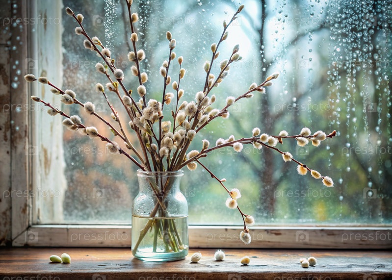 Большой план букета ивы в стеклянной вазе на фоне старого белого окна с капельками дождя на стекле