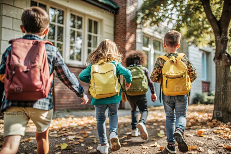 Праздник приходится на 1 сентября. Дети с желтыми рюкзаками бегут в школу. Обратный взгляд. Давайте вернемся в школу. Концепция нового учебного года в школе. Осенний день знаний