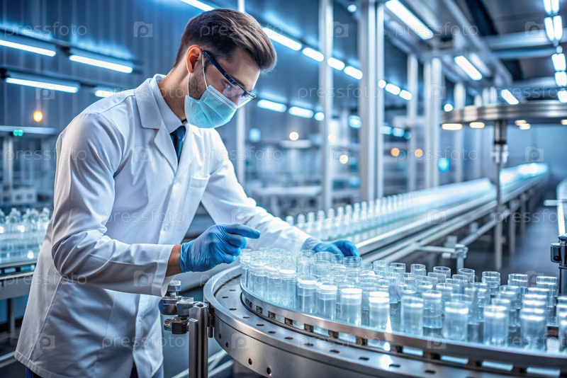 Производство лекарств: фармацевт тестирует медицинские флаконы на автоматическом трубопроводе фармацевтической производственной линии с использованием искусственного интеллекта