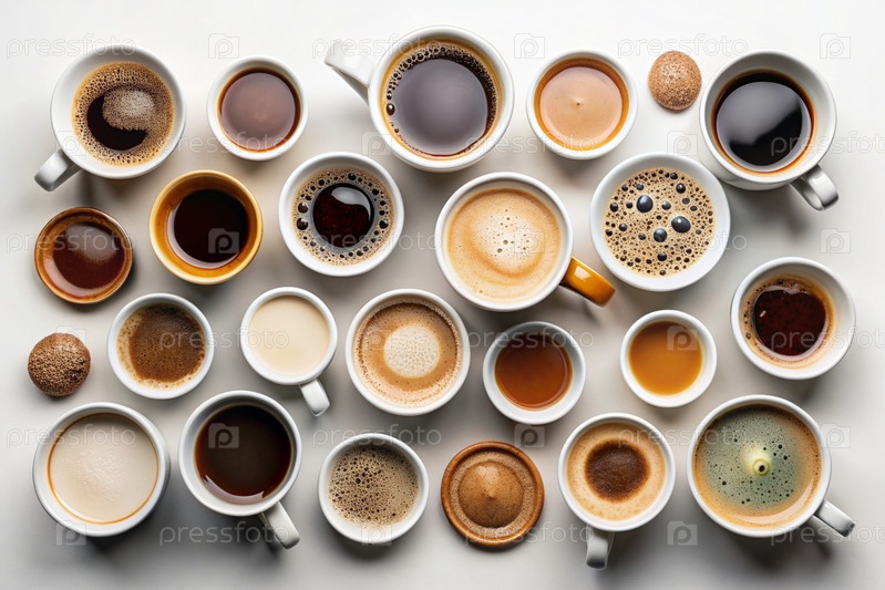 Много различных кофейных напитков на белом столе