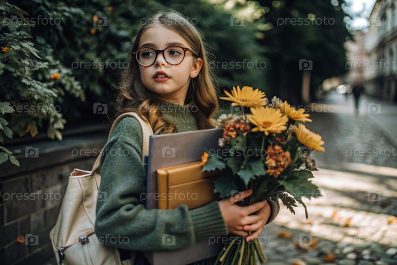 Красивая девушка с очками и букетом осенних цветов впервые идет в школу. Ребенок со школьной сумкой, книгой и цветами. Малыш на городской улице