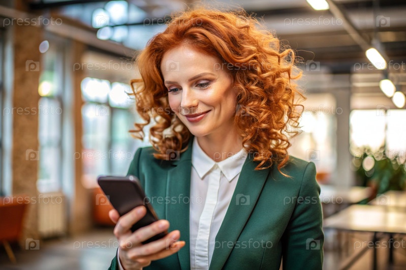Деловая женщина с локонами красных волос и веснушками. Она одета в обычное зеленое пиджак. В руках смартфон. Небольшой бизнесмен смотрит на свой мобильный телефон