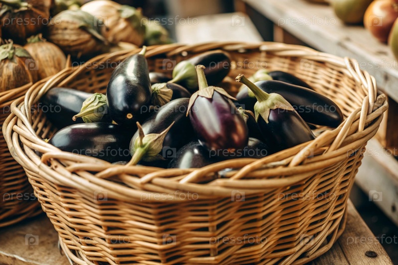 Концепция выращивания продуктов питания. свежие органические баклажаны на фермерском рынке. богатый урожай баклажан в плетеновой корзине