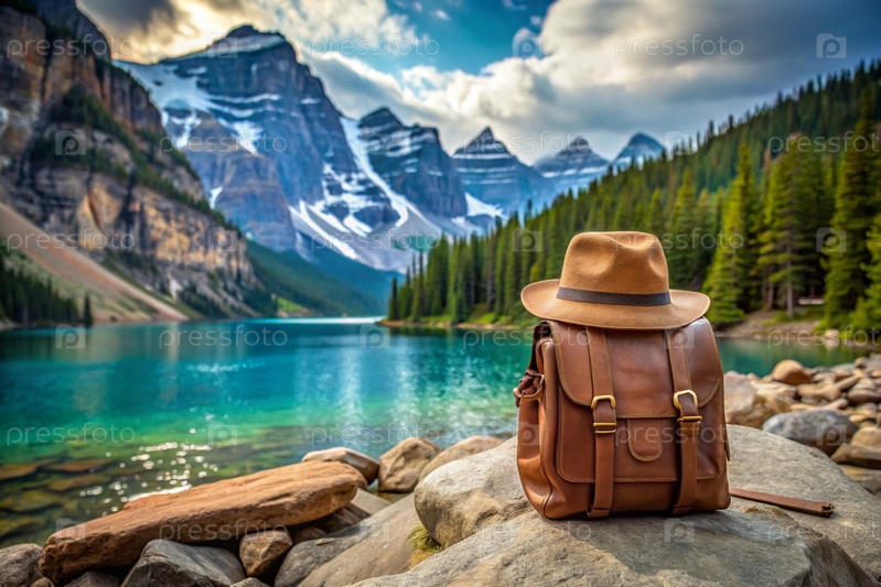 Стильный коричневый кожаный рюкзак и шляпа на фоне живописного озера и гор