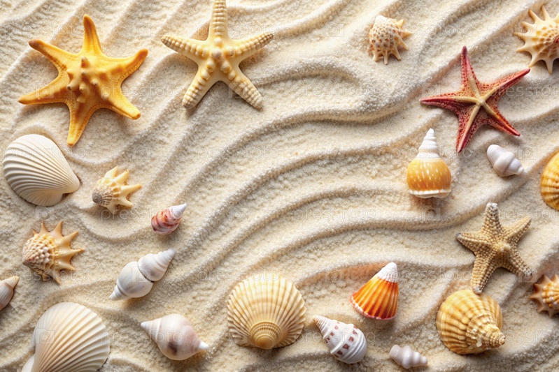Концепция морского отдыха. Ракушки в песке. История летних каникул. Копия макета текста. Вид сверху