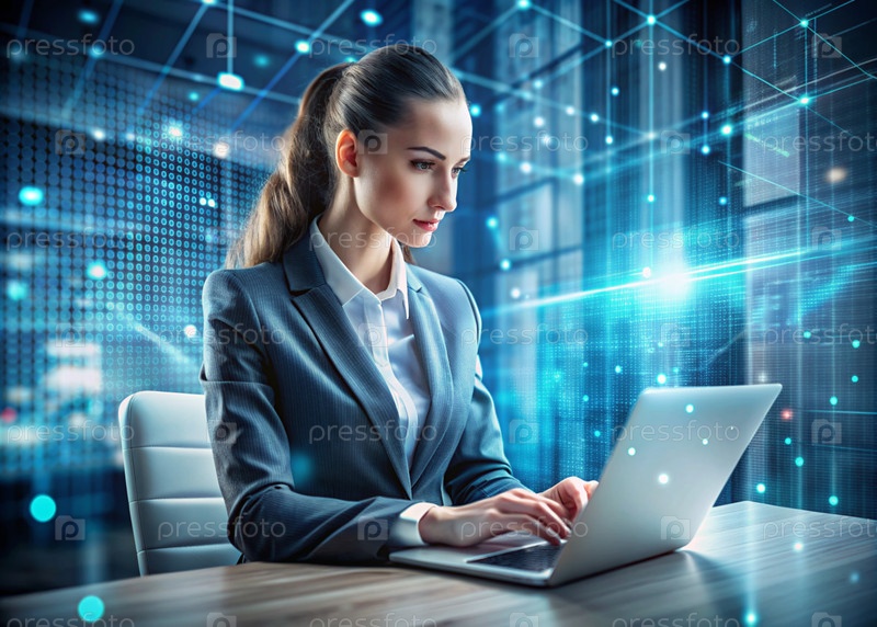 Красивая молодая женщина в костюме работает на ноутбуке в офисе с цифровыми кодами на виртуальном экране Цифровые технологии будущего Разработка программного обеспечения