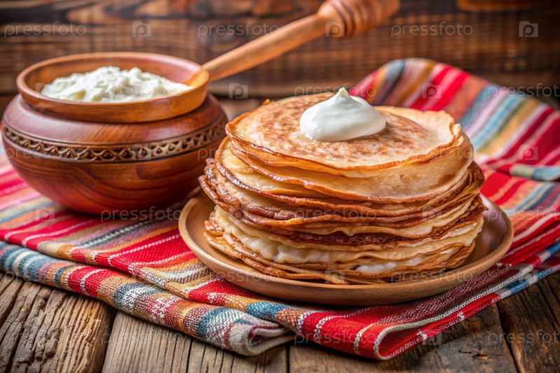 Вкусные блины с кислой смесью.Блины упаковываются в большую кучу.Концепция русского праздника Масленицы