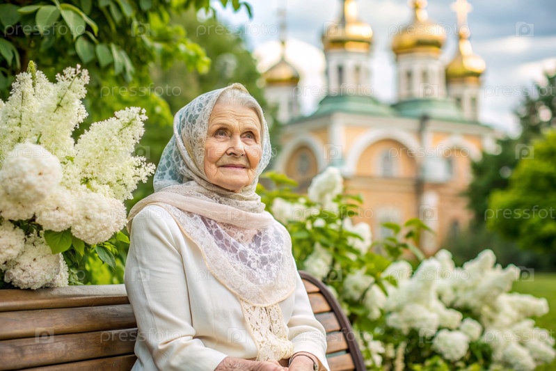 Пожилая бабушка в плато сидит на скамейке рядом с цветущим деревом перед православным храмом