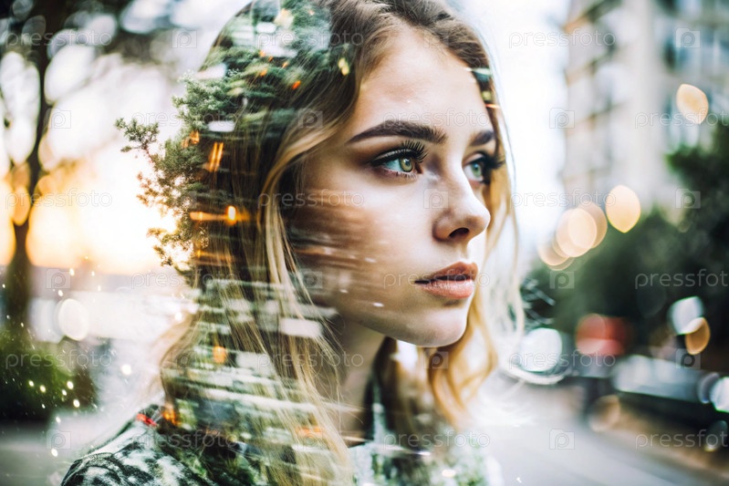 Портрет молодой женщины.Концептуальное искусство Клубовое изображение на фоне города с двойной экспозицией и визуальными эффектами