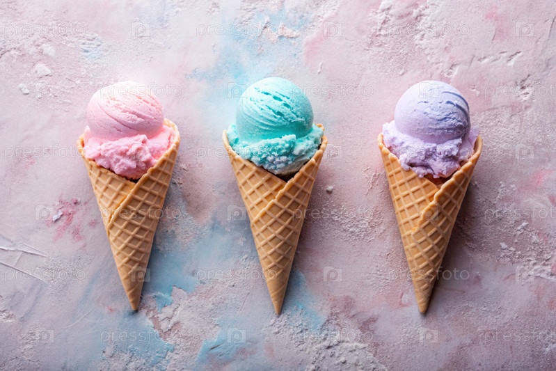 сладкий десерт. морозильные шишки разных вкусов. синий, розовый и фиолетовый мороженое на фоне трех пастельных цветов: синего, розового и фиолетового
