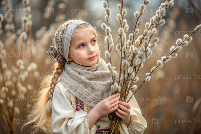 Пальмовое воскресенье. христианство. портрет трехлетней девочки в русском народном шале с ветвями ивы в руках на фоне цветущей ивы