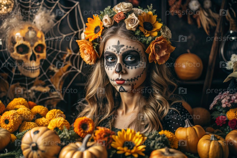 Концепция Хэллоуина. Ужасно. Костюмированная вечеринка. Красивая женщина с покрашенным черепом на лице и цветами на голове. Баннер, открытка