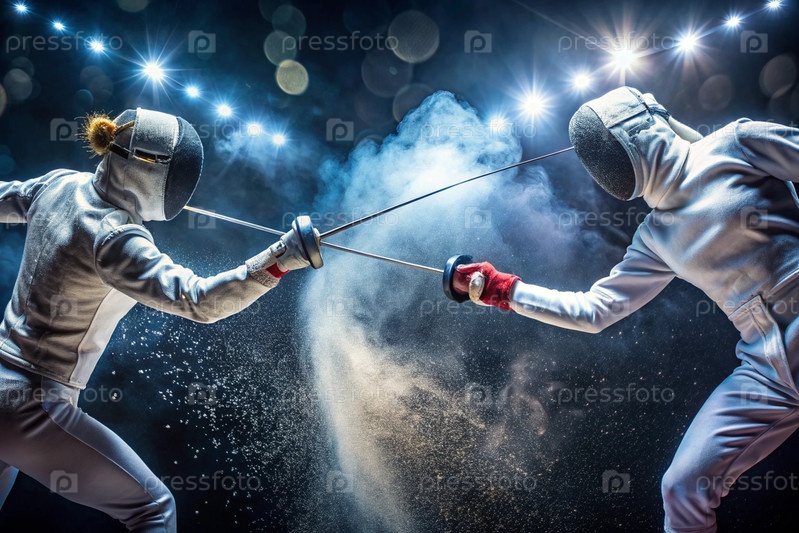 Фехтовальщики на арене с рапирами в руках во время тренировок дерутся в дуэли. Спортивное фехтование. Фехтование является типом летних Олимпийских игр