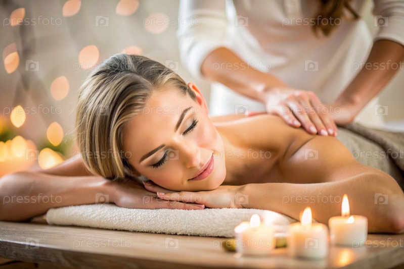 Баннер для профессиональных массажных салонов.Молодая, красивая блондинка наслаждается массажем в современном спа при свечах.Освобождение и гармония, уход за телом