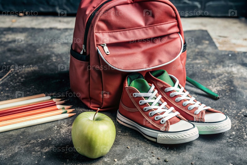 Праздник приходится на 1 сентября. рюкзак, кроссовки, яблоко и карандаши. вернемся в школу. концепция нового учебного года в школе. осенний день знаний