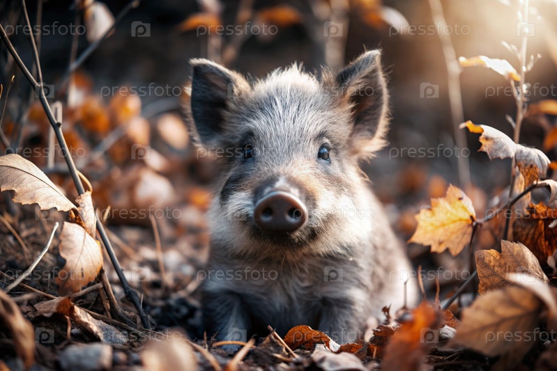 Красивый кабан, сидящий среди осеннего желтого листья.Охота на животных