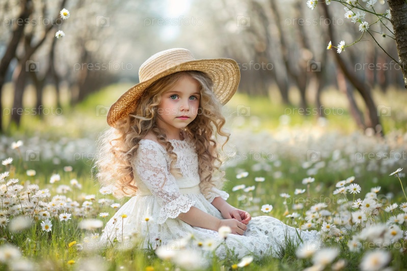 Всероссийский день семьи, любви и верности Красивая маленькая кудрявая девочка в соломенной шляпе с букетом ромашки на фоне поля. День святого Валентина Петра и Февронии