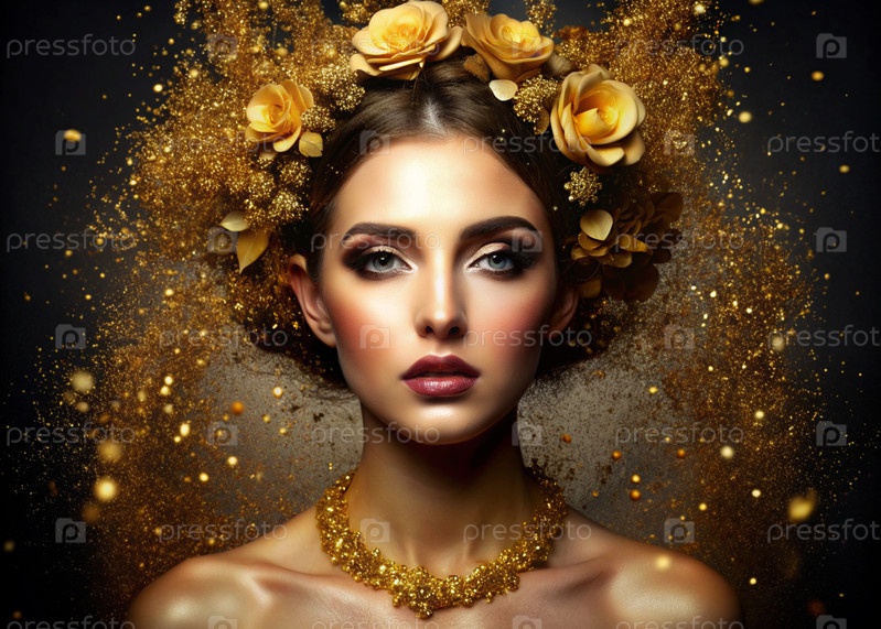 Творческий баннер для салона красоты в черно-золотых тонах. Профессиональный макияжный художник, стилист и парикмахер. Красивая женщина с вечерним гримом и золотым цветочным венком на голове. Индустрия красоты