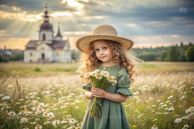 Всероссийский день семьи, любви и верности Красивая маленькая кудрявая девочка в соломенной шляпе с букетом ромашки на фоне поля. День святого Валентина Петра и Февронии