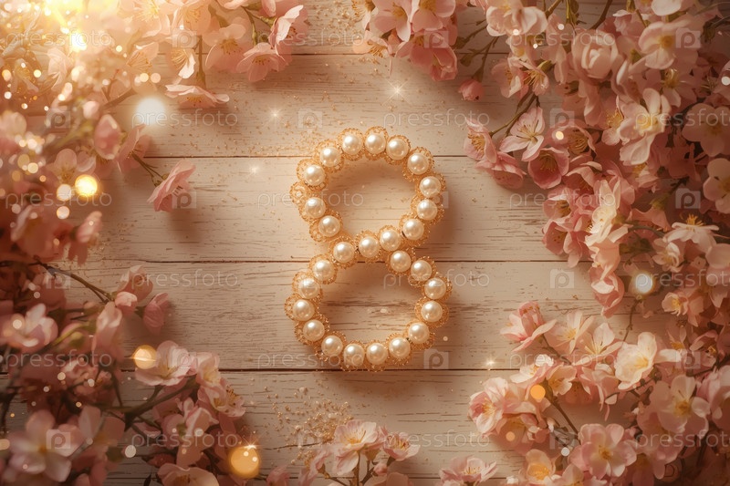 Международный женский день. праздник приходится на 8 марта. баннер, флаер. праздничный мягкий розовый цветочный фон с номером 8
