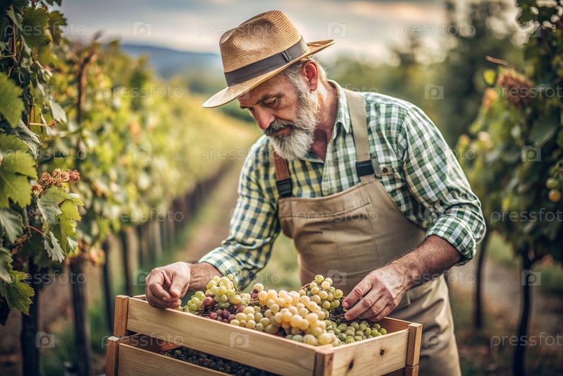 Сельскохозяйственная промышленность. Производство вина. Деревянный ящик с виноградом в руках фермера-мужчины. Садовник собирает богатый урожай. Ближе, солнечный свет. Осенний плодовый сбор