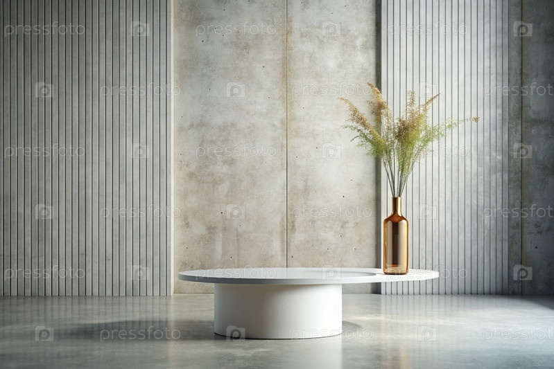 Минимальный фон для демонстрации продукта. Современная сцена подиума с текстурированной бетонной стеной и стеклянной вазой. Элегантный дизайн для презентации продукта
