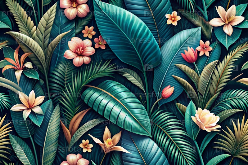Иллюстрация.Фон тропических листьев, пальмовых листьев и тропических цветов.Прекрасный абстрактный фон для баннера