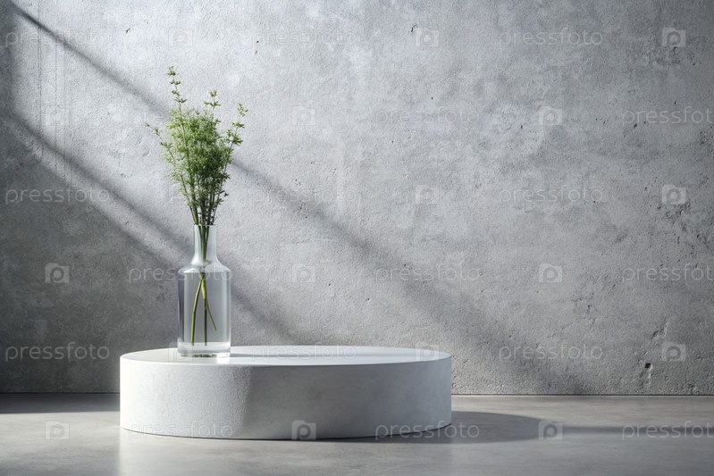 Минимальный фон для демонстрации продукта. Современная сцена подиума с текстурированной бетонной стеной и стеклянной вазой. Элегантный дизайн для презентации продукта
