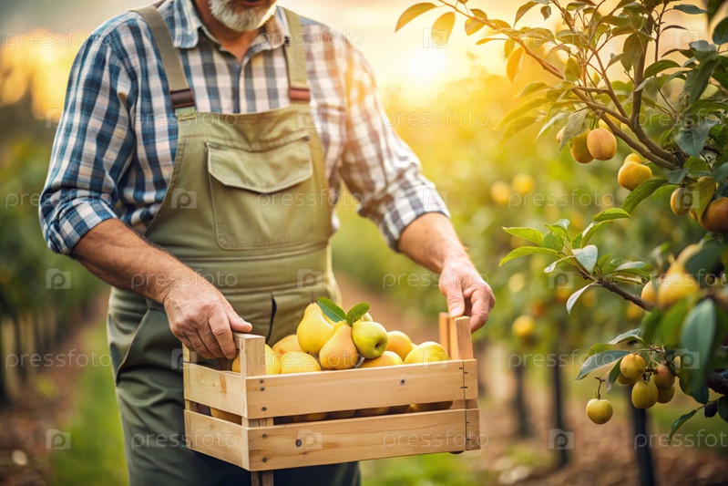 Сельскохозяйственная промышленность. Деревянный ящик с грушами в руках фермера-мужчины. Садовник собирает богатый урожай. Ближе, солнечный свет. Осенний сбор фруктов и овощей